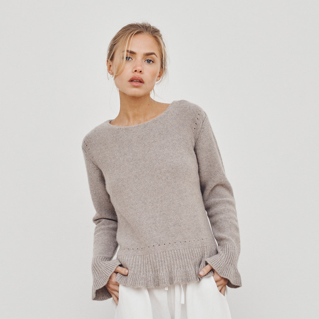 A very pretty and beautiful soft handmade jumper with a feminine ruffle at the bottom and on each sleeve.