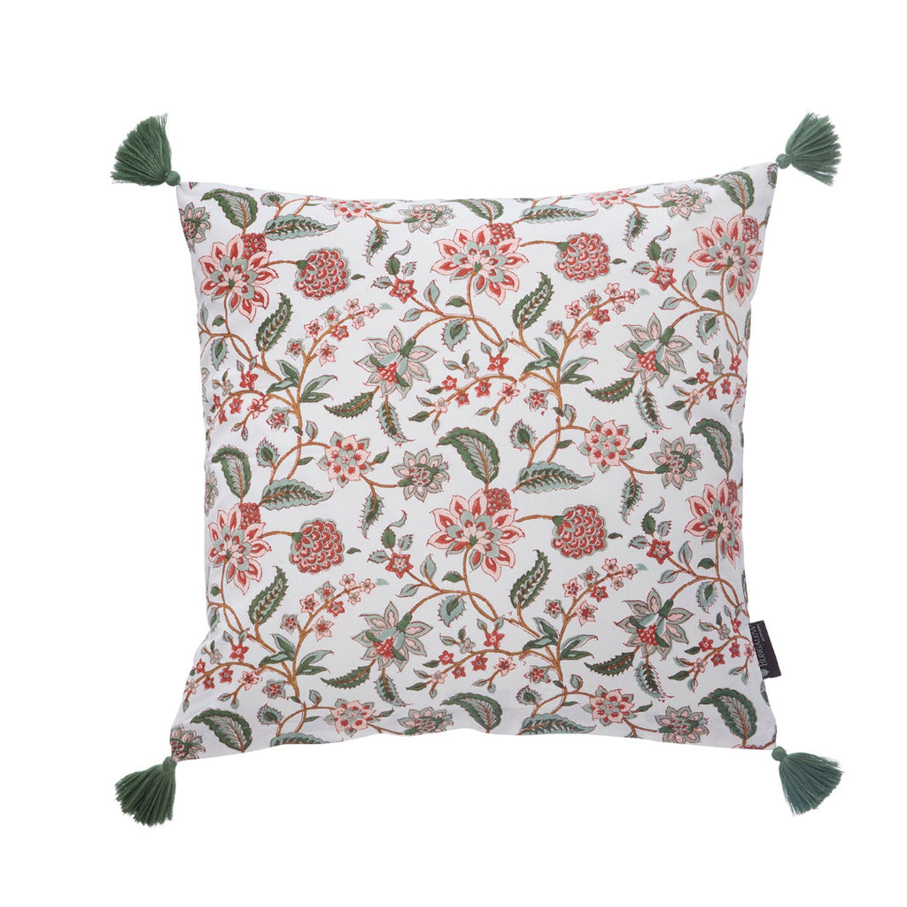 An elegant cushion featuring a floral design with contrasting tassels at each corner. Block printed by hand on 100% cotton. Zip enclosure. Includes the cushion pad inside.