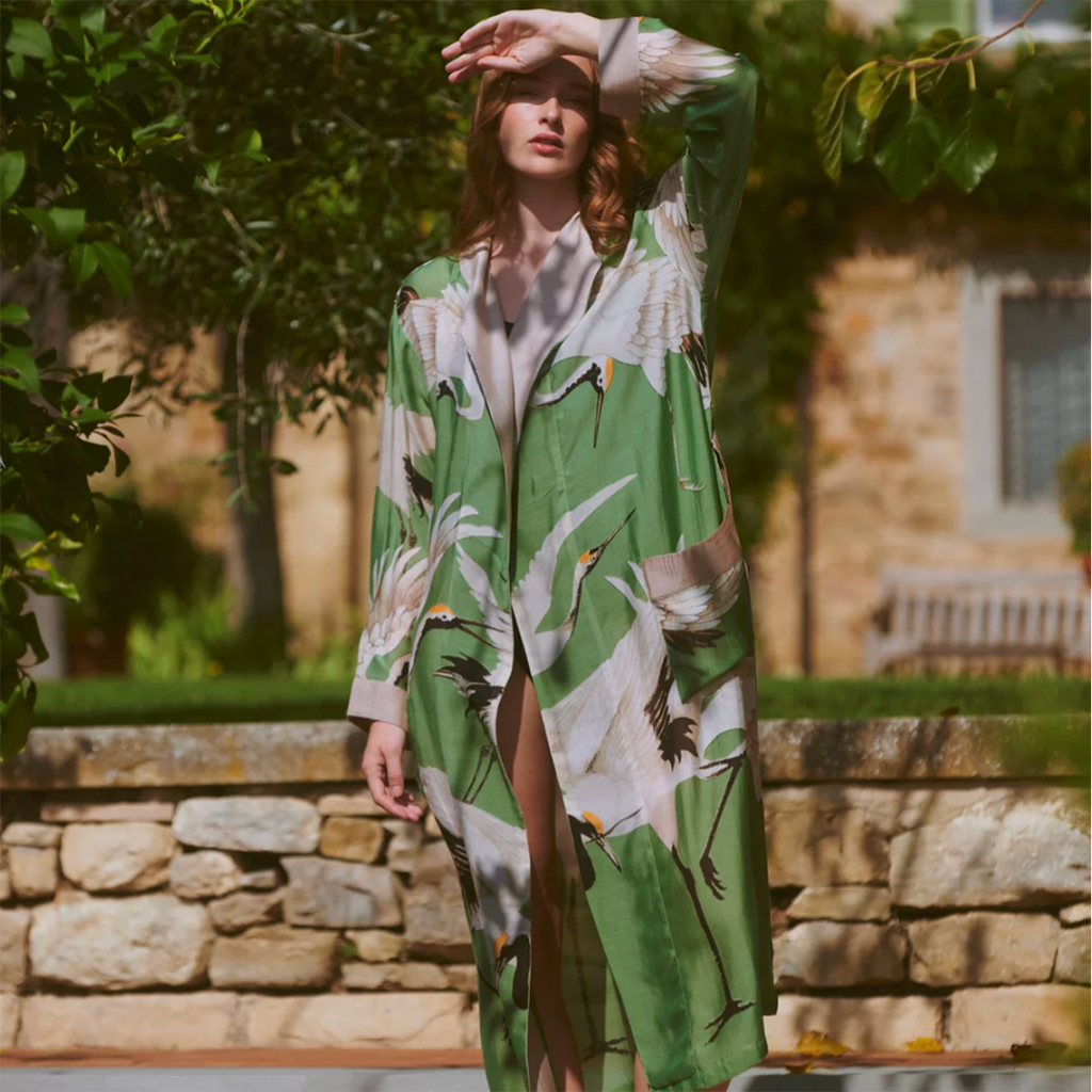 Our elegant, long sleeved dressing gown looks equally good worn at night or in the day, at home or on holiday. Made from soft, silky, lightweight fabric which hangs gently. Lapel, cuffs and pockets are trimmed with colour, co-ordinating fabric. There are loops stitched on either side for the belt, which is included. Other fabric designs and colours are available in our shop and on our website.