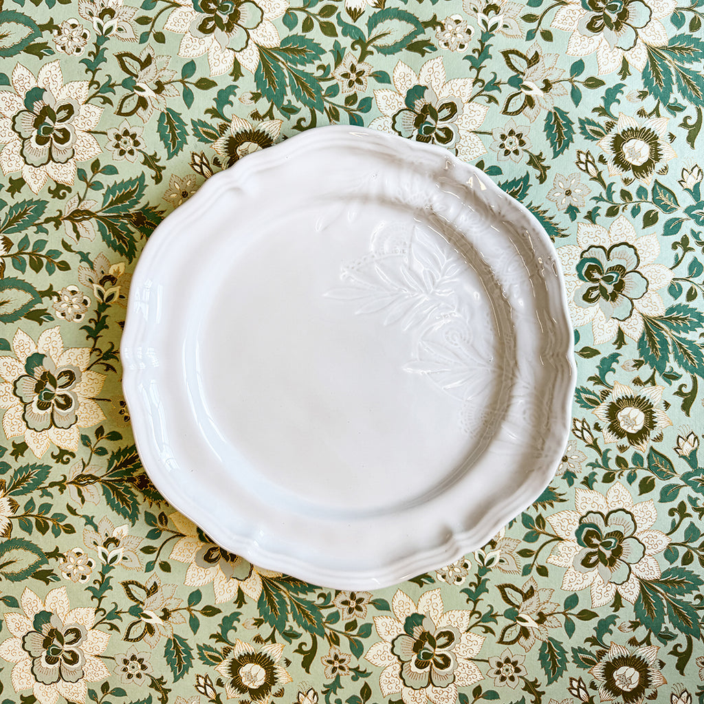 A generous dinner plate from the creative studio of Sthal. Made from durable white stoneware, it is exquisitely decorated with an arabesque design and a glossy crackle glaze finish. Each piece is unique.