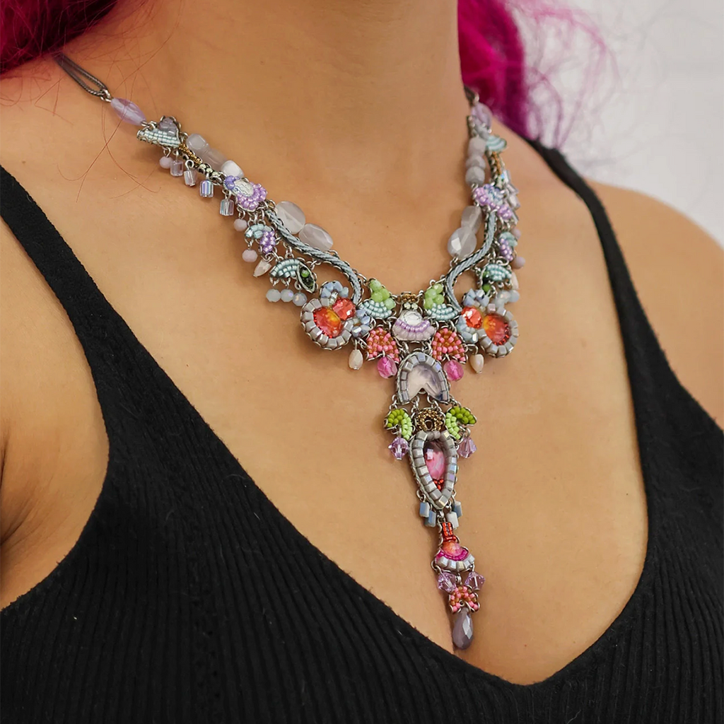 A Selection of Materials Used: Semi-precious stones, faceted glass, fabric inlays, seed pearls, seed beads, silver-plated brass, metal alloys. Nickel and lead free.