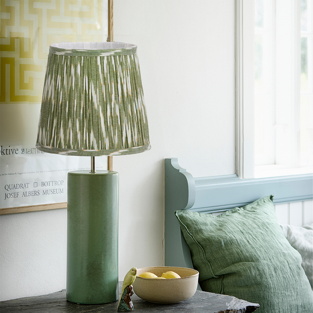 A slightly tapered, lightly pleated, green lampshade with a white zig-zag effect, which will diffuse your bulb beautifully from too much light. We have a green ceramic lamp stand available in our shop and on our website that will complete your look perfectly.