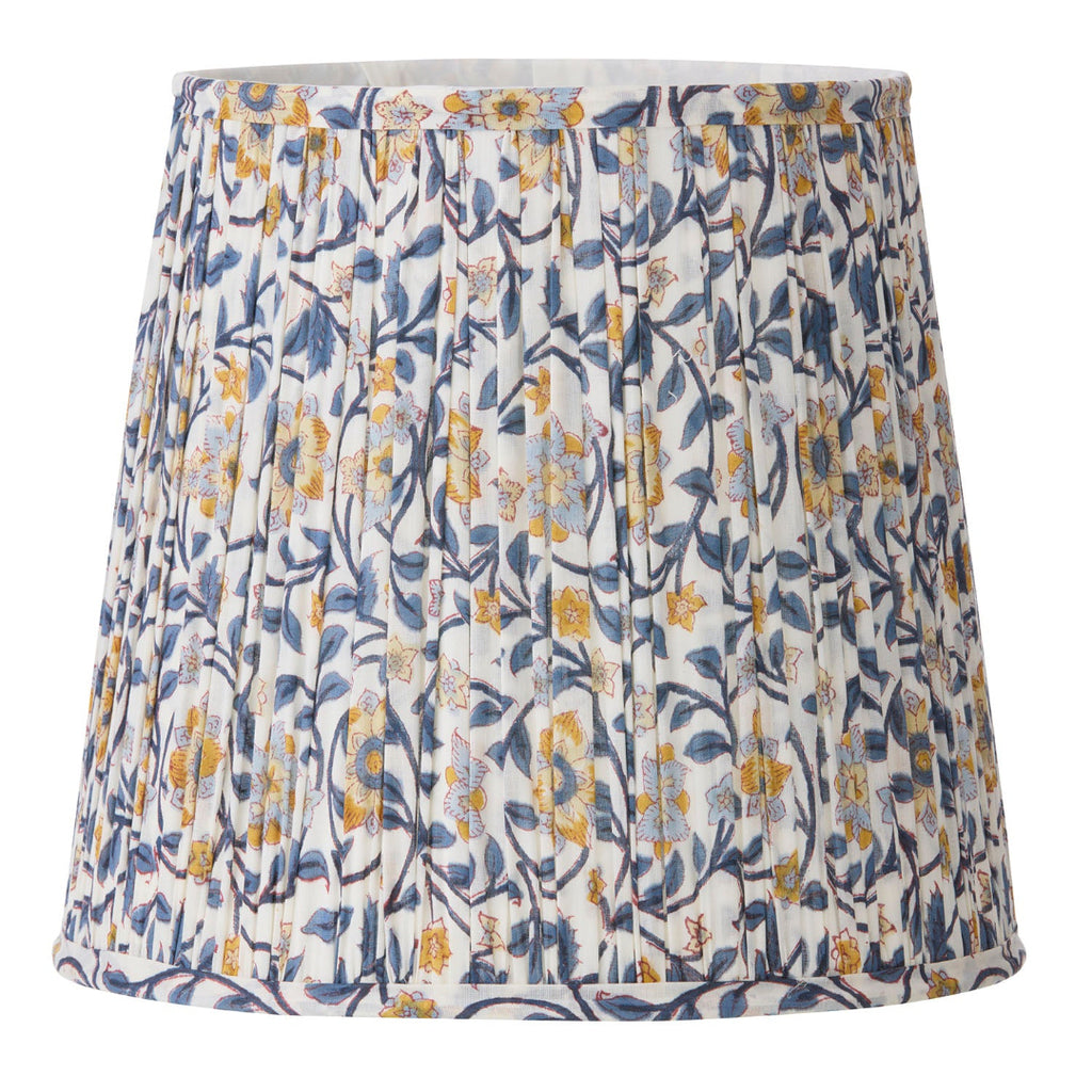 A slightly tapered, lightly pleated, lampshade in summery colours of blue and yellow. Match with a deep blue ceramic table lamp 'Miguel Indigo' available in our shop and on our website. It will complete your look perfectly.