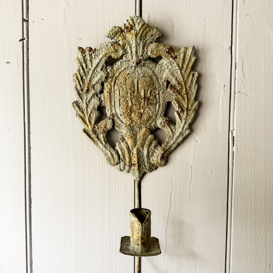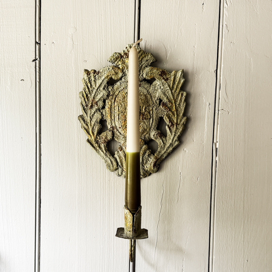 A wonderful, regal wall sconce, decorated with branches. Made from metal which has been oxidized, creating a lovely gold and green patina. Designed to hold a short dinner candle and there is a hanging hook on the back for convenience. Would look stunning hung on a tall, garden brick wall for those warm summer evenings. Dinner candles, in various colours and sizes, are available in our shop and on our website.