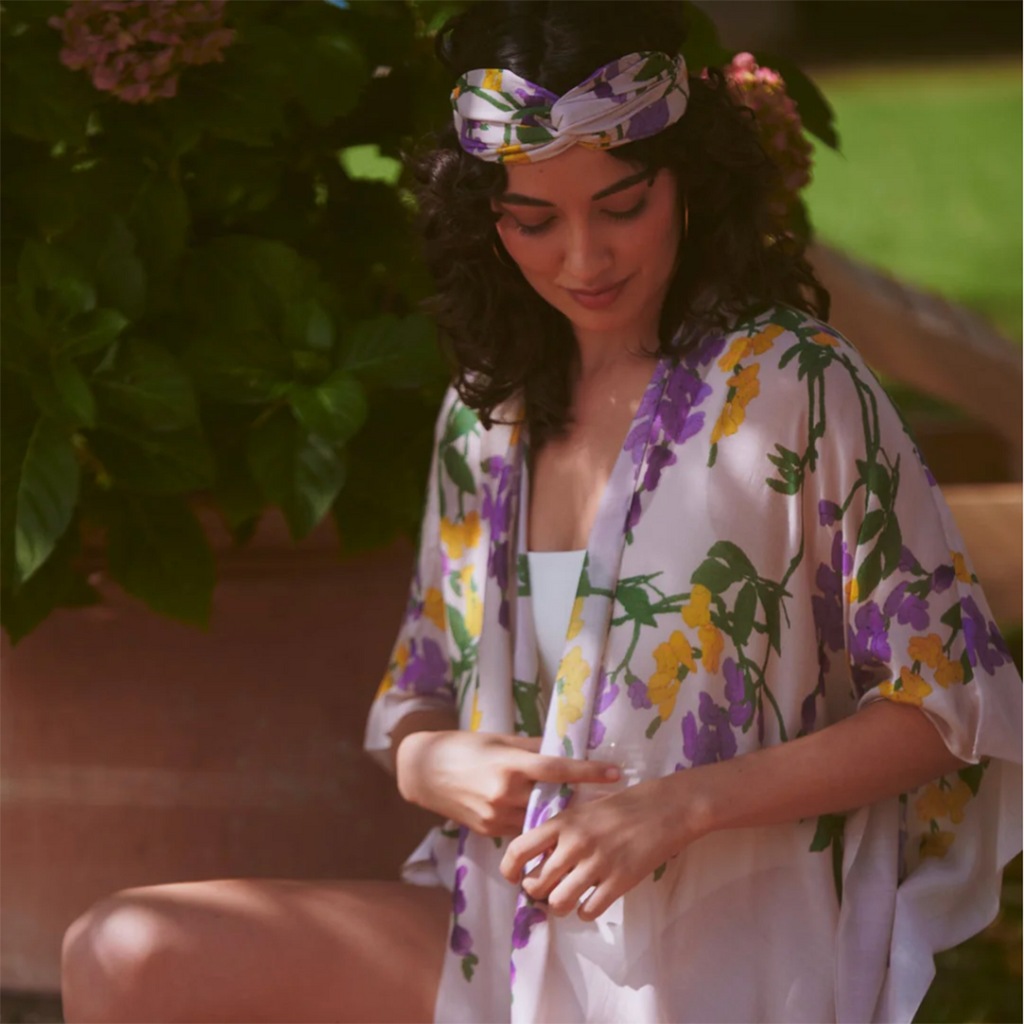 Cover up in elegant style with this beautiful light-weight throwover from 'One Hundred Stars'. Hand screen printed with their signature, striking illustrations. Perfect for lounging around on holiday or at home.