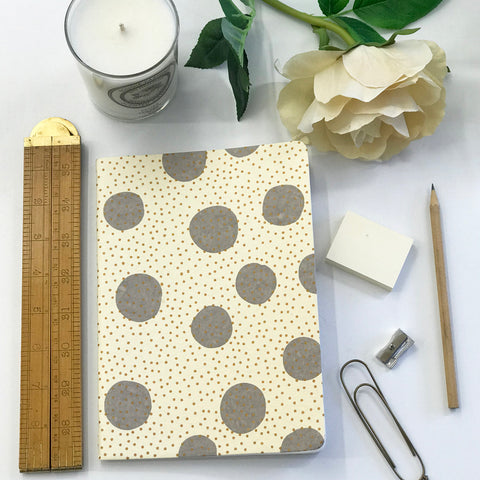 The Bungalow Chavara Gold A5 Notebook. Gold and Grey Small Spots.