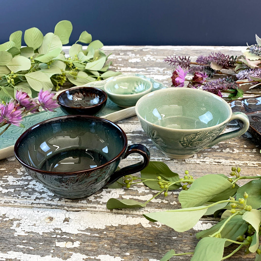 Delightful coffee or tea cups from the creative studio of Sthal. Made from durable white stoneware, it is exquisitely decorated with an arabesque design and a glossy crackle glaze finish. Each piece is unique.