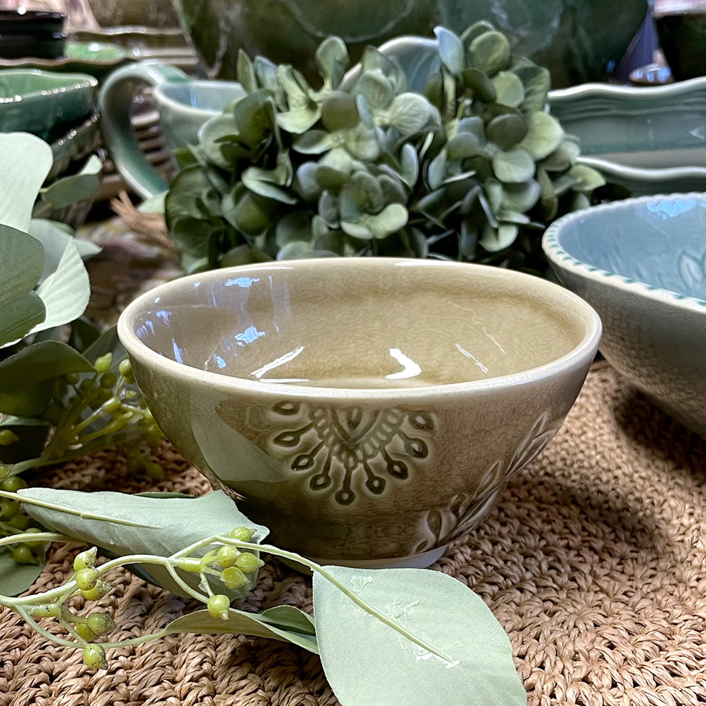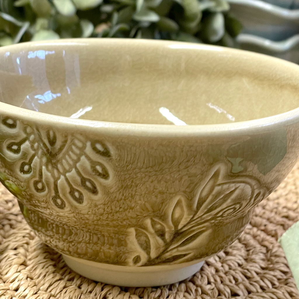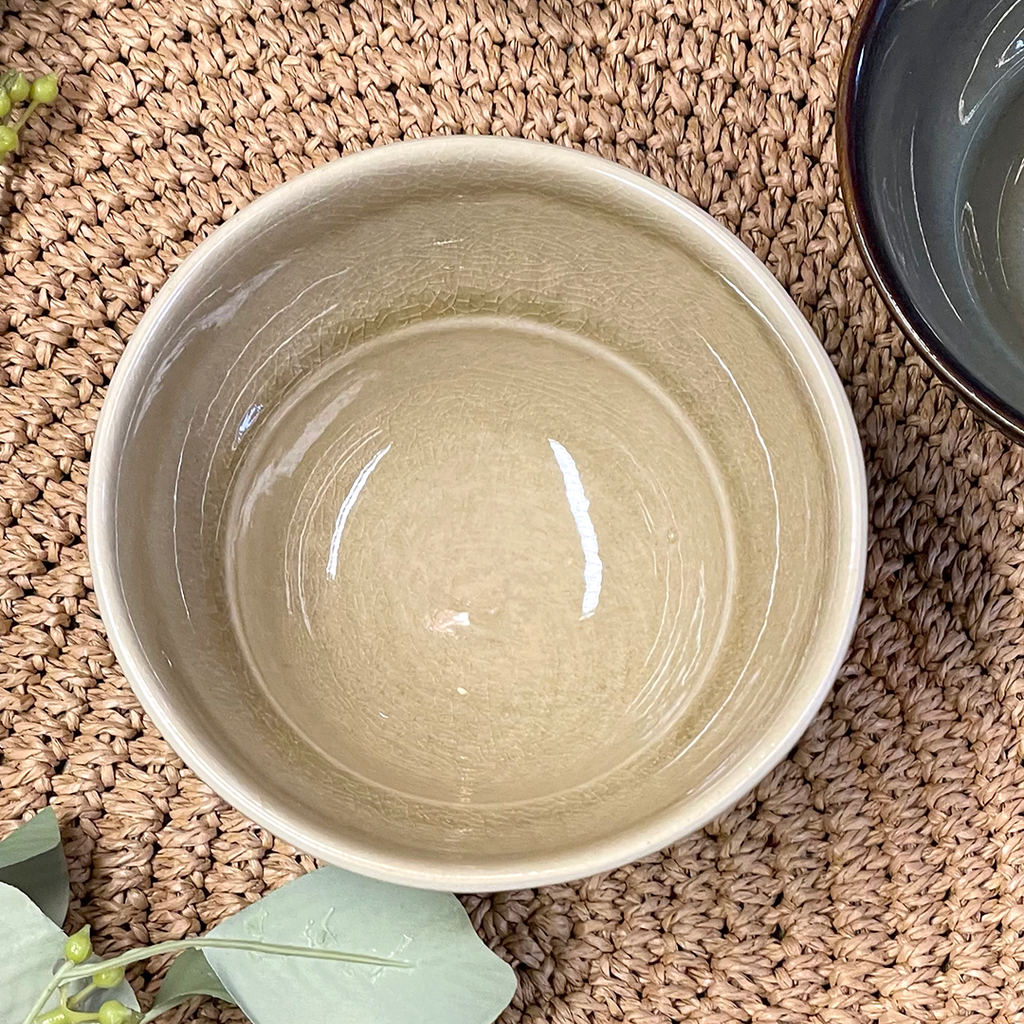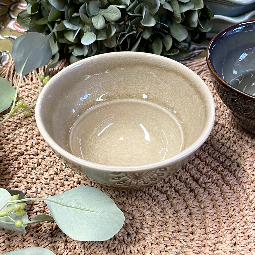 Japanese style coffee or tea cup with no handle from the creative studio of Sthal. Made from durable white stoneware, it is exquisitely decorated with an arabesque design and a glossy crackle glaze finish. Each piece is unique.