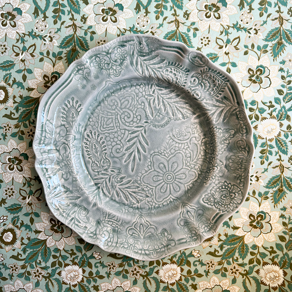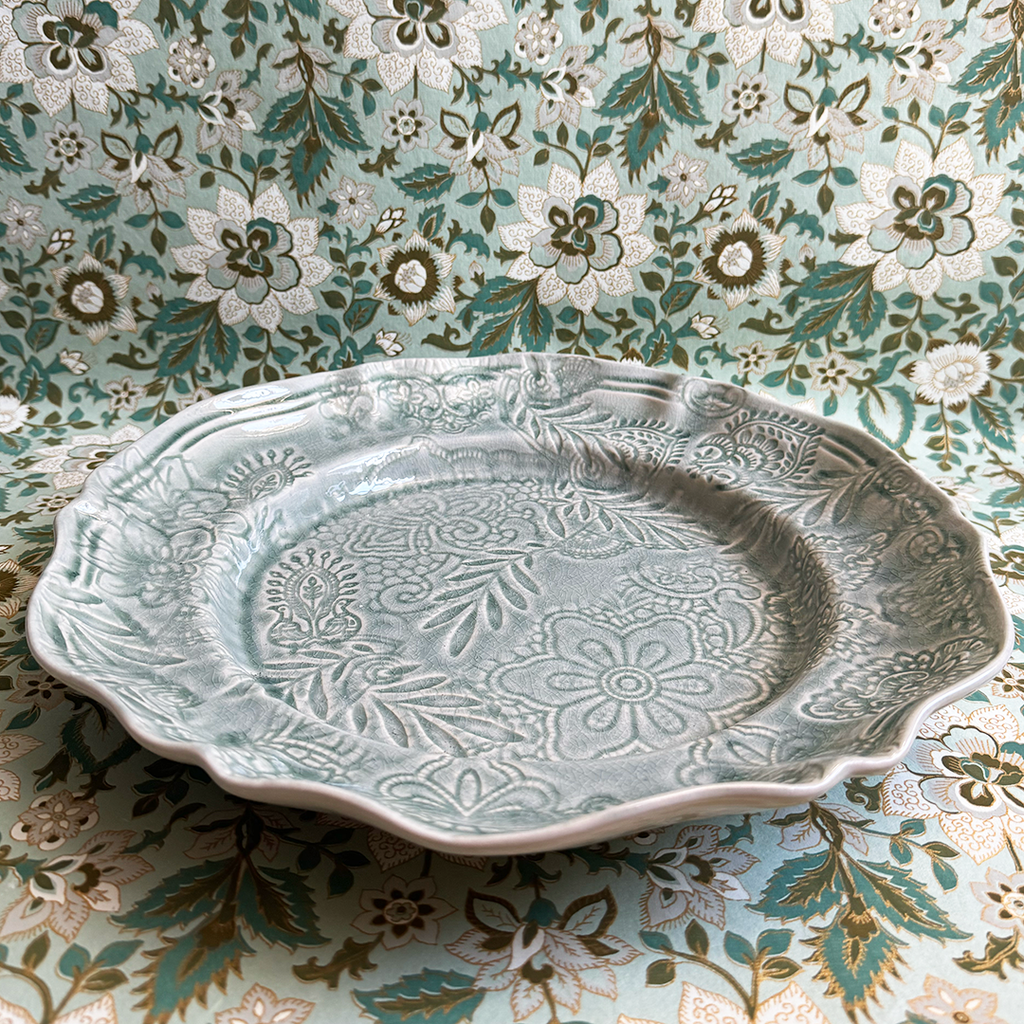 A stunning round serving plate from the creative studio of Sthal. Made from durable white stoneware, it is exquisitely decorated with an arabesque design and a glossy crackle glaze finish. Each piece is unique.