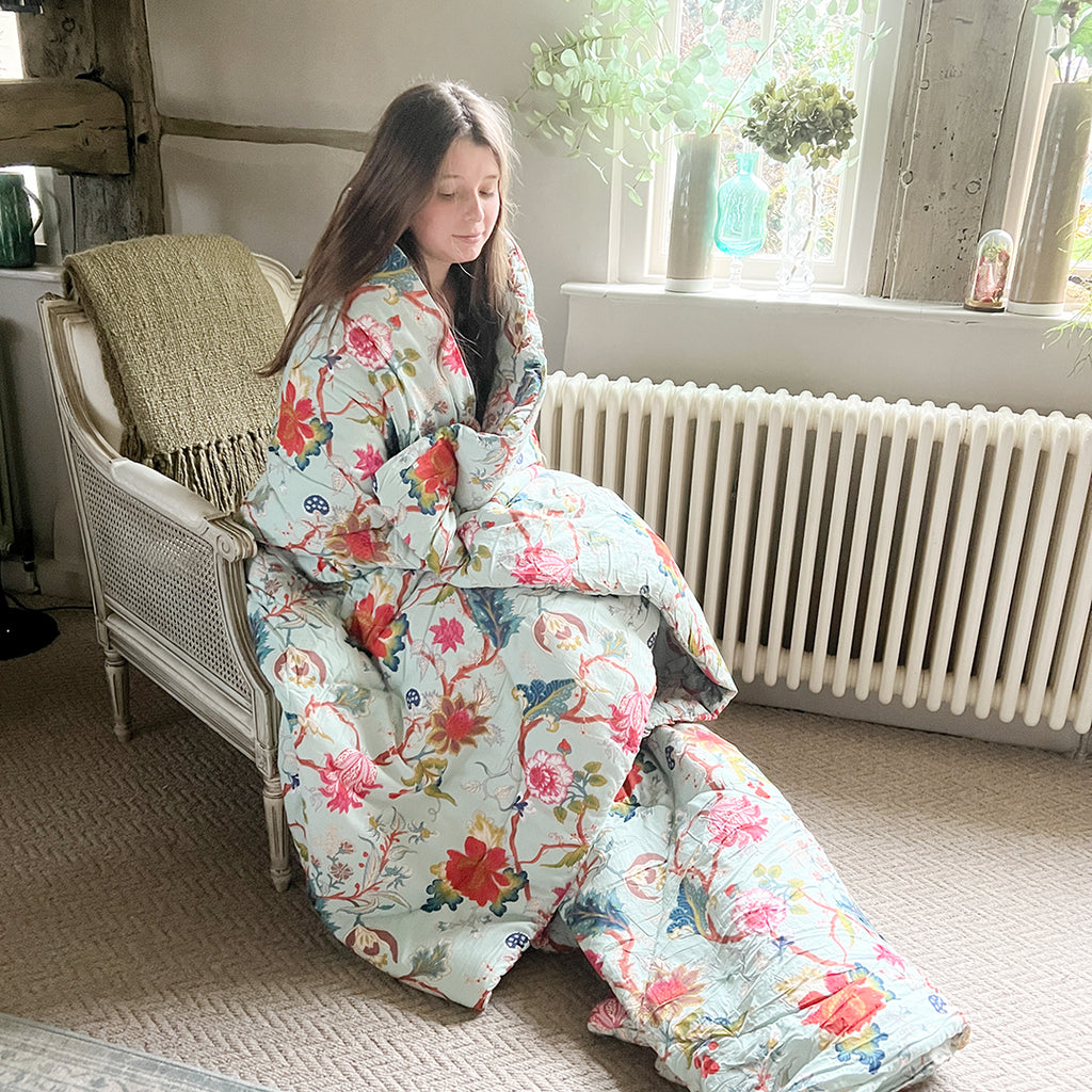100% cotton outer with the print on both sides with a lightweight hollow fibre filling, they are 220cm x 265cm. They can be layered over the end of the bed to add layers and colour.