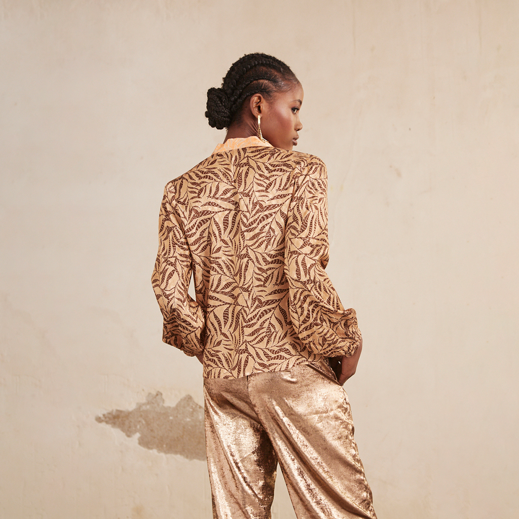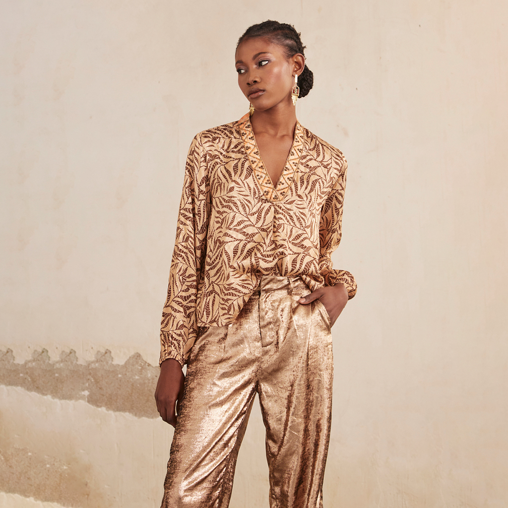 Camel 'Ambika' long-sleeved, patterned blouse with an embroidery and rhinestone around the neckline.