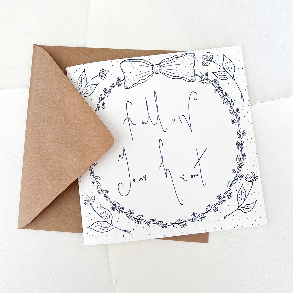 Pretty handmade greetings card featuring the words 'Follow Your Heart' within a delightful floral illustration. Paired with a kraft paper envelope. Blank inside for your own message.