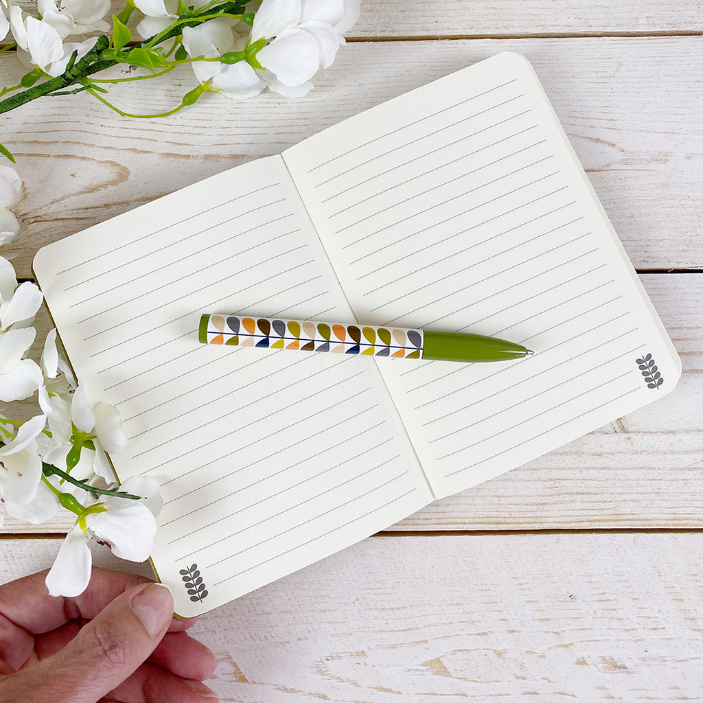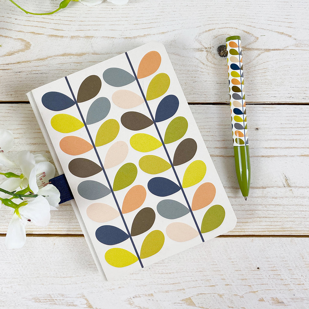 Orla Kiely multi stem notebook and pen, the notebook has lines inside for your notes.