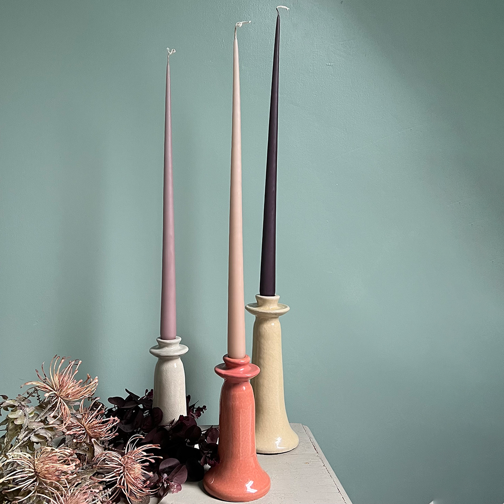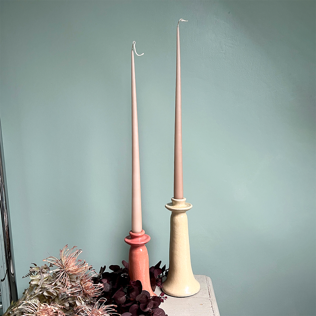 A pair of tall slim and elegant dinner candles in a beautiful pale Latte coffee colour.