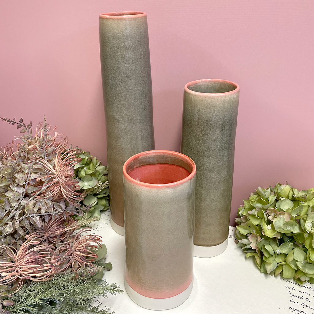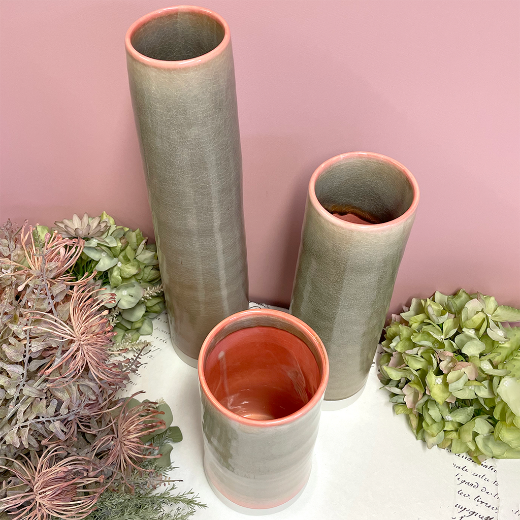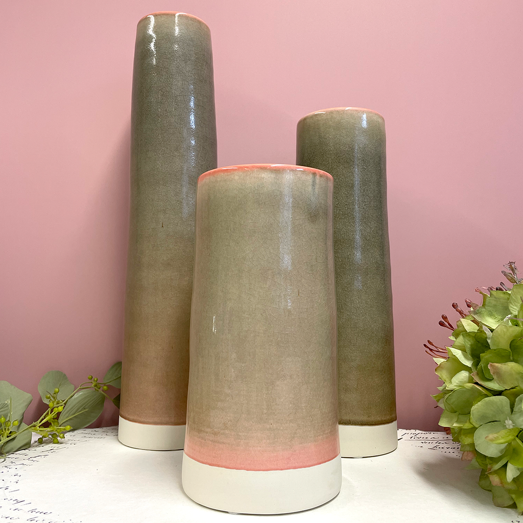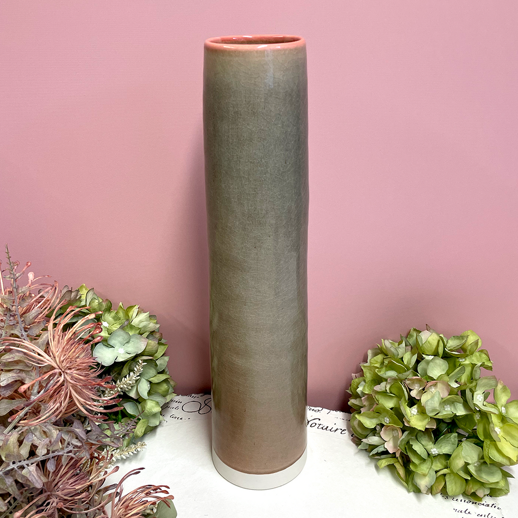 A beautiful handmade ceramic vase in two-tone pastel shades with a crackle glaze finish.