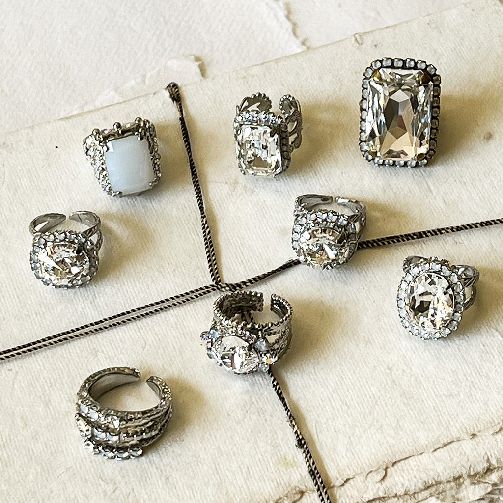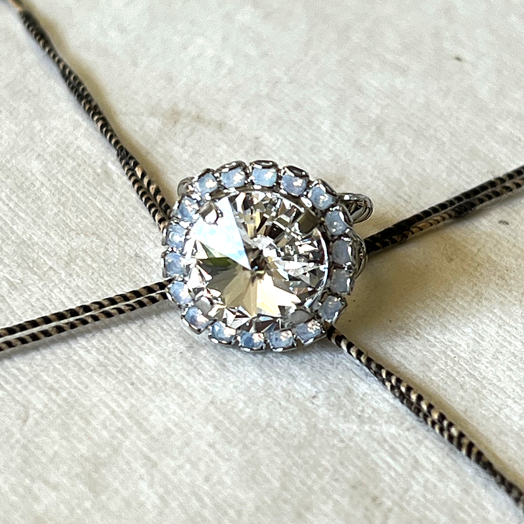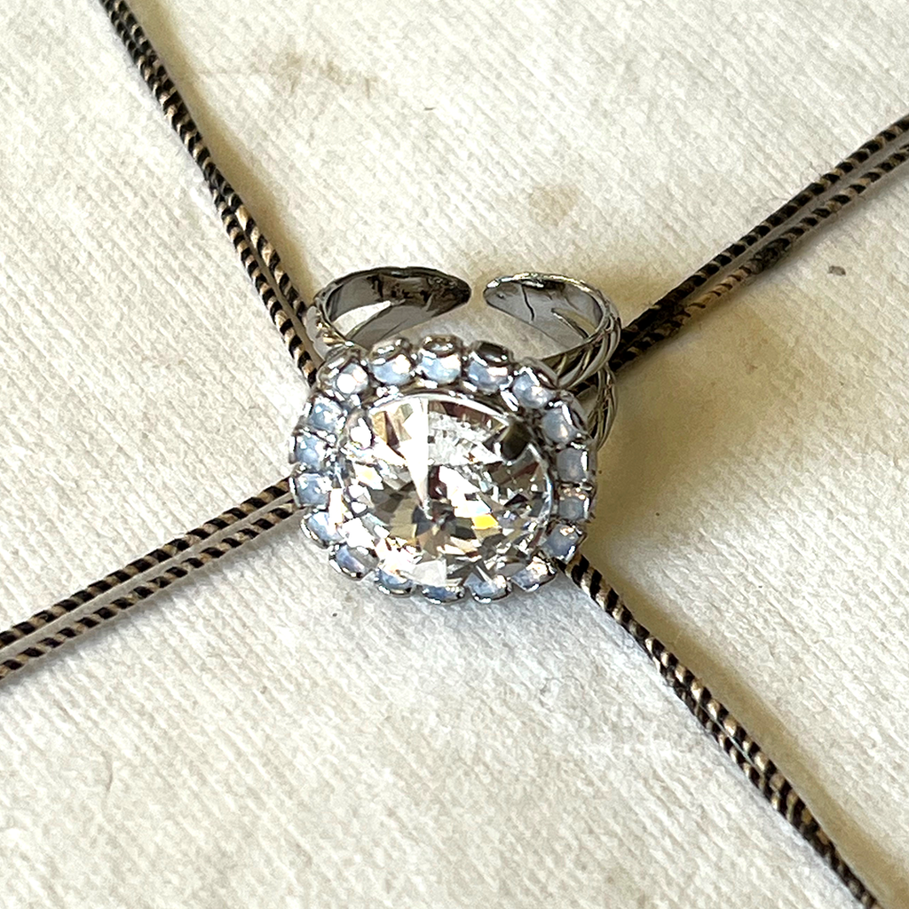 A stunning handcrafted ring, featuring a claw-set round cut crystal with a beautiful border of pearl white crystal stones and a twisted effect double antique silver-tone band.