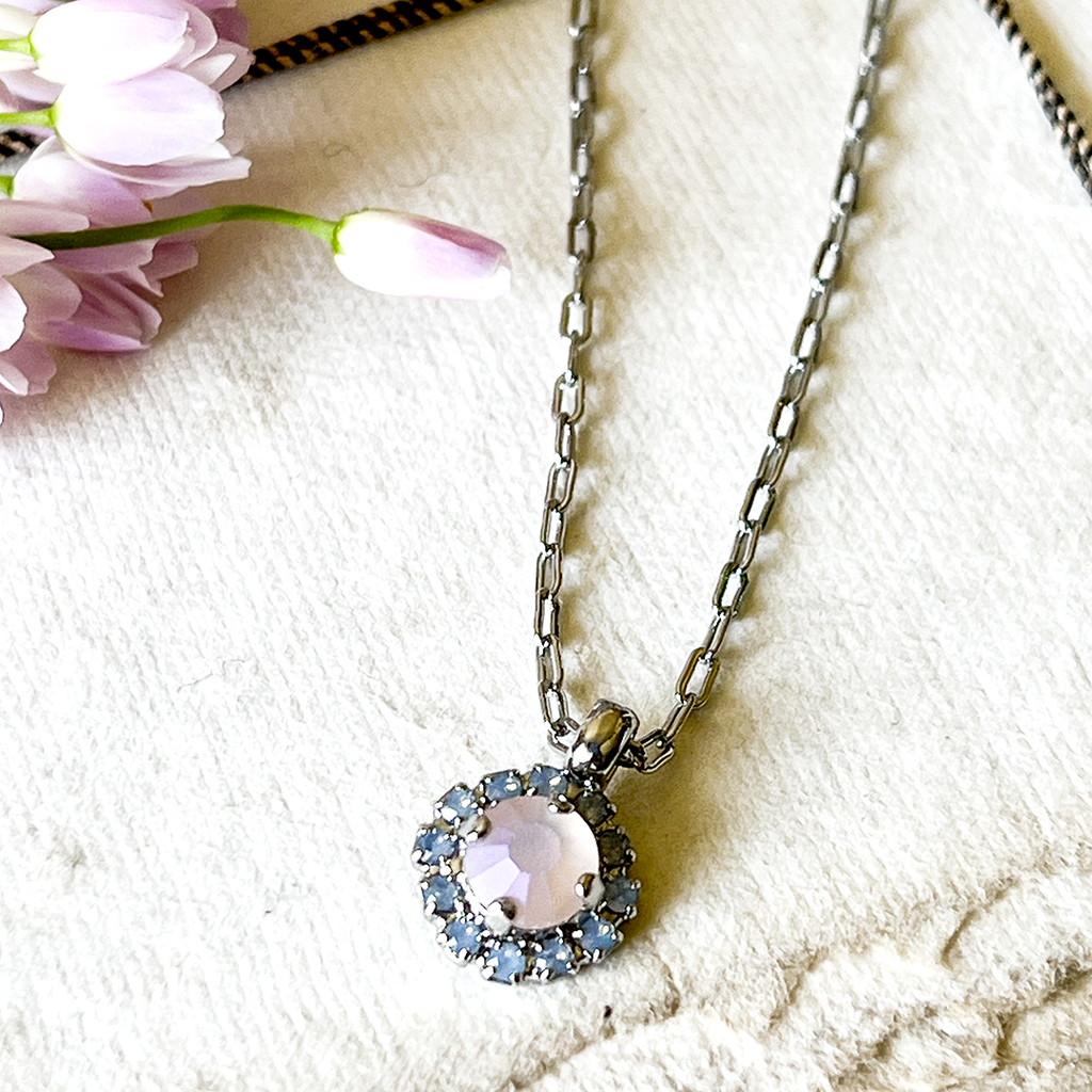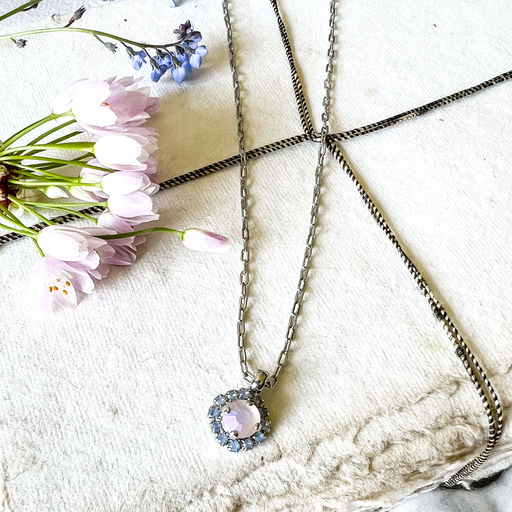 A stunning handcrafted necklace, featuring a claw-set pale pink coloured crystal surrounded by a circle of cloudy blue gems, hanging from a delicate palladium silver chain.
