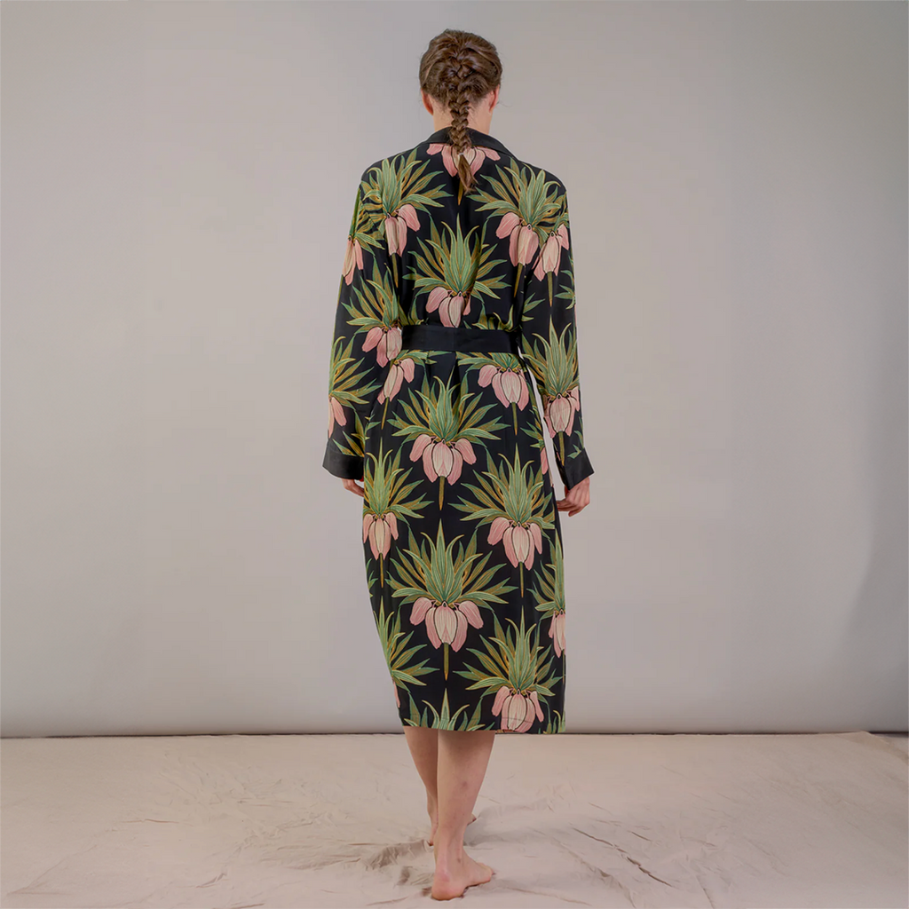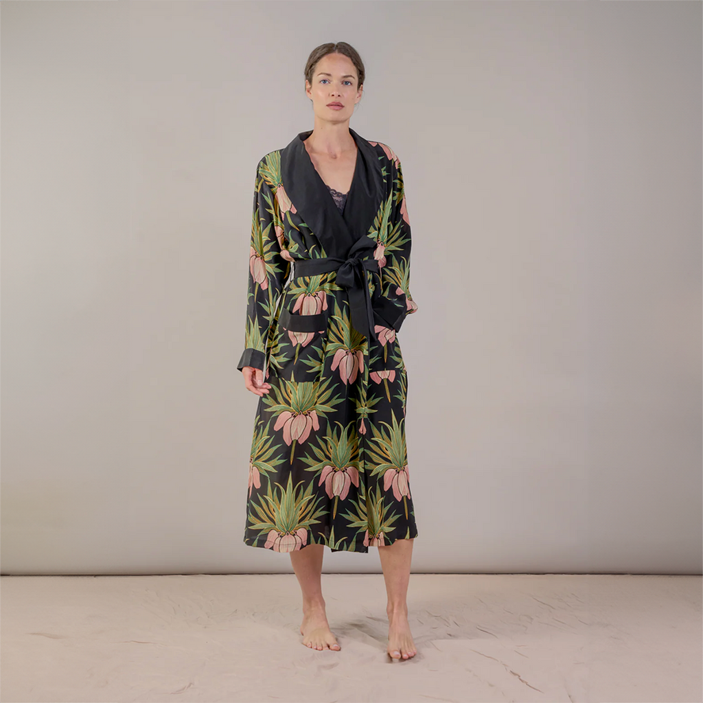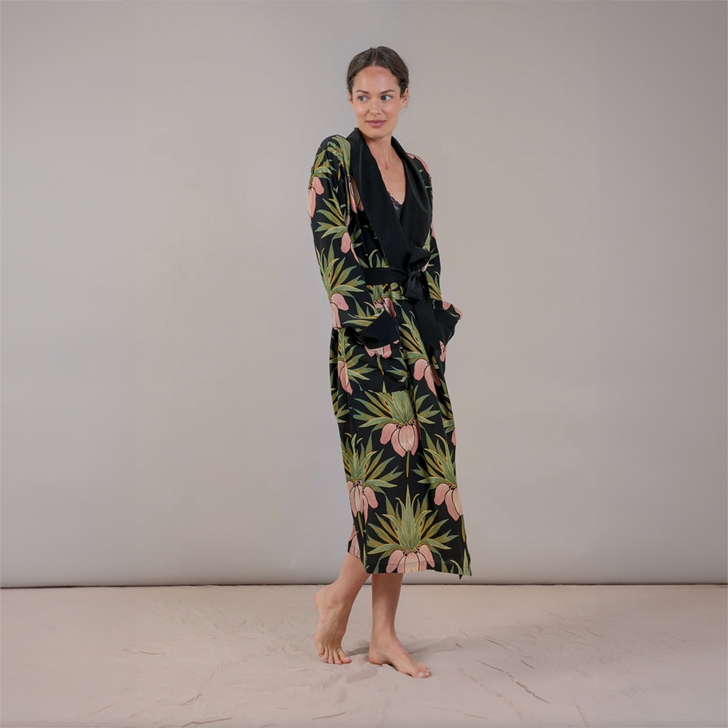Our elegant, long sleeved dressing gown looks equally good worn at night or in the day, at home or on holiday. Made from soft, silky, lightweight fabric which hangs gently. Lapel, cuffs and pockets are trimmed with colour, co-ordinating fabric. There are loops stitched on either side for the belt, which is included.