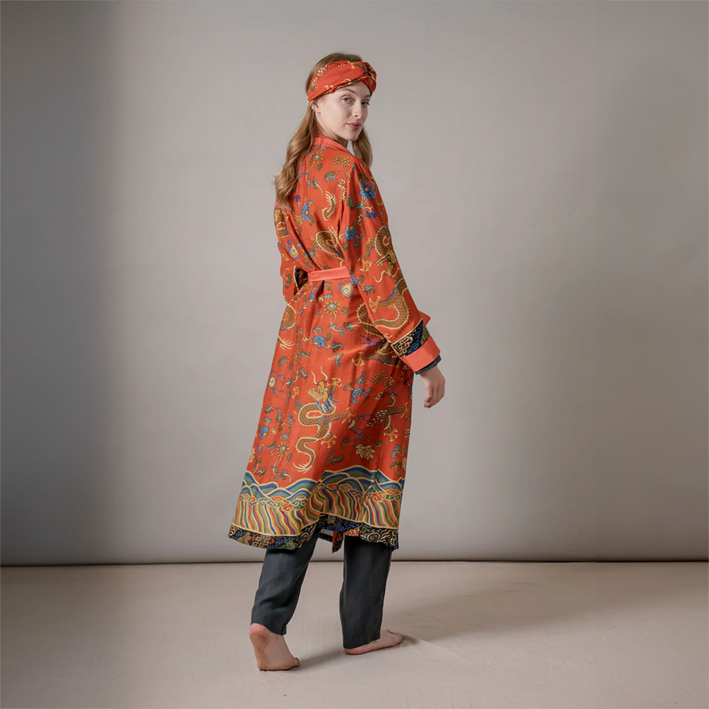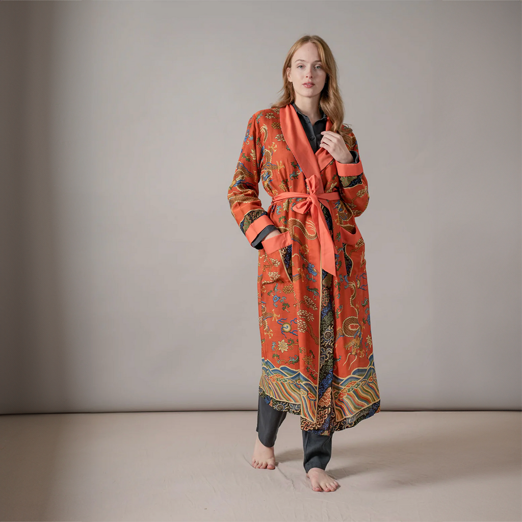 Dragon rust long sleeve, featuring gold dragons and a geometric border on a rich rust background. Made from a blend of cupro and modal, making the gown silky soft and very lightweight.