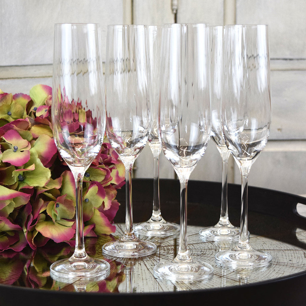 Elegant set of four Champagne Flute glasses. Matching Champagne Saucers, White and Red Wine Glasses available in our shop or on our website.