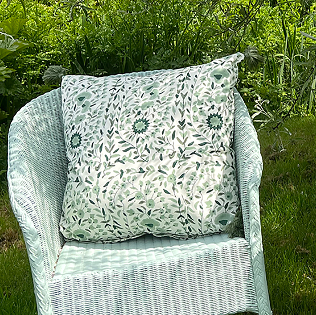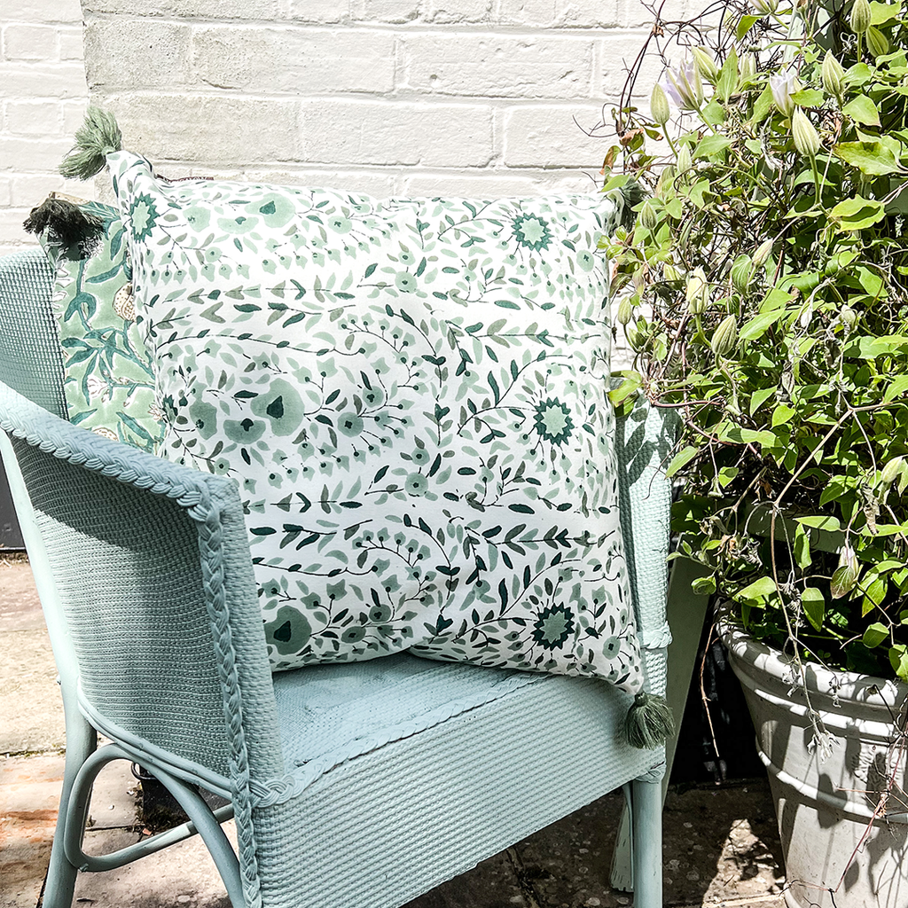 An elegant square cushion featuring a green floral pattern and Jade-Green tassels on the corners. Zip enclosure. Includes the cushion pad inside.
