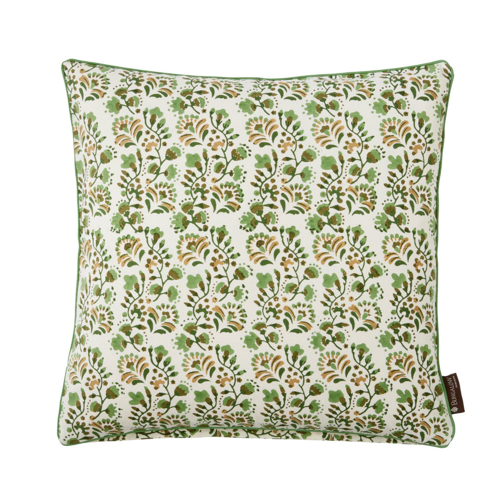An elegant square cushion featuring a floral pattern in tones of green with green piping. Block printed by hand on 100% cotton. Zip enclosure. Includes the cushion pad inside.