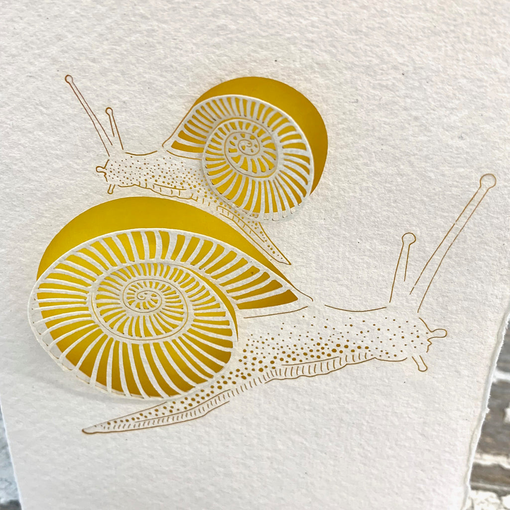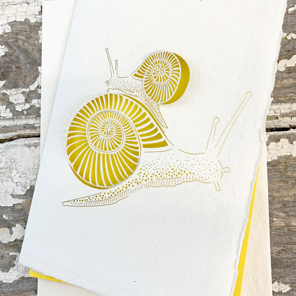 A beautifully intricate laser cut greetings card for any occasion, featuring push out snails revealing a golden yellow insert paper. This eco friendly, handmade card is made from 100% recycled cotton fibres and papers from sustainably managed forests. Wrapped in biofilm.