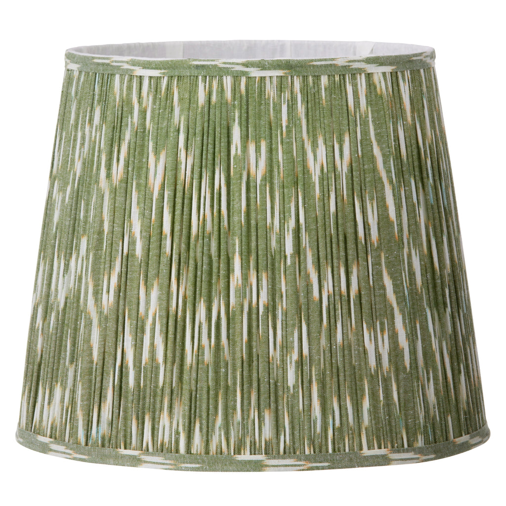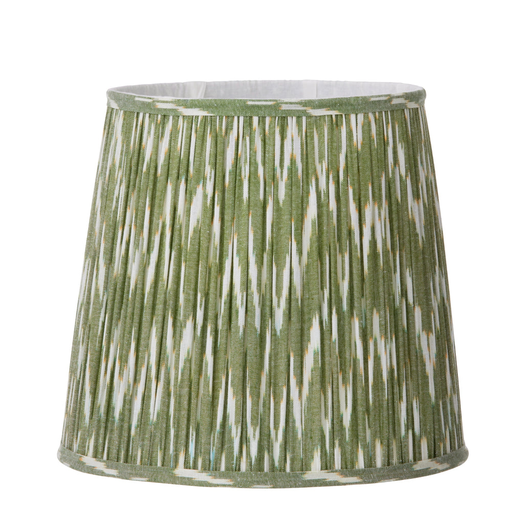 A slightly tapered, lightly pleated, green lampshade with a white zig-zag effect, which will diffuse your bulb beautifully from too much light. We have a selection of ceramic lamp stand available in our shop and on our website that will complete your look perfectly.