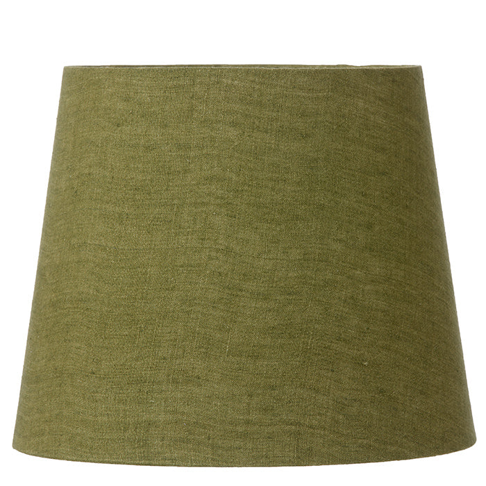 A slightly tapered, deeply coloured, olive green lampshade which will diffuse your bulb beautifully from too much light.