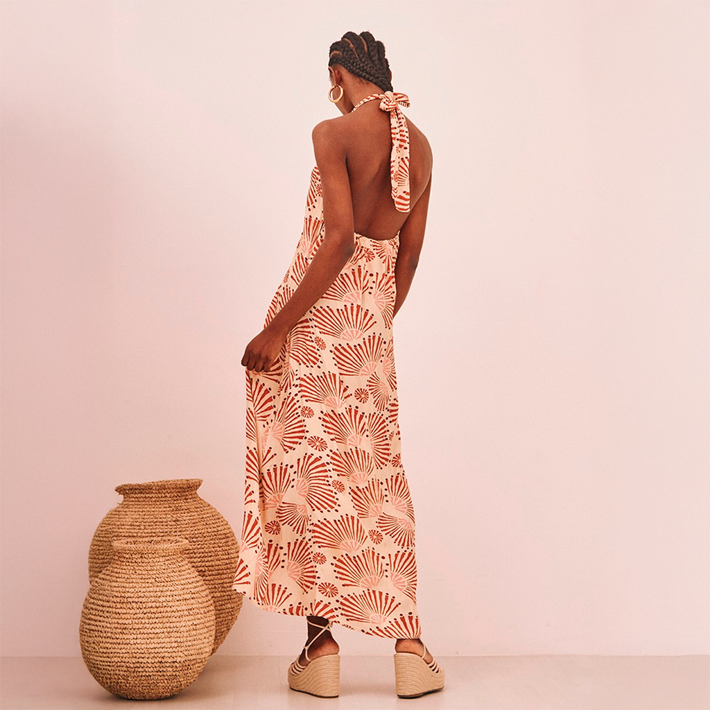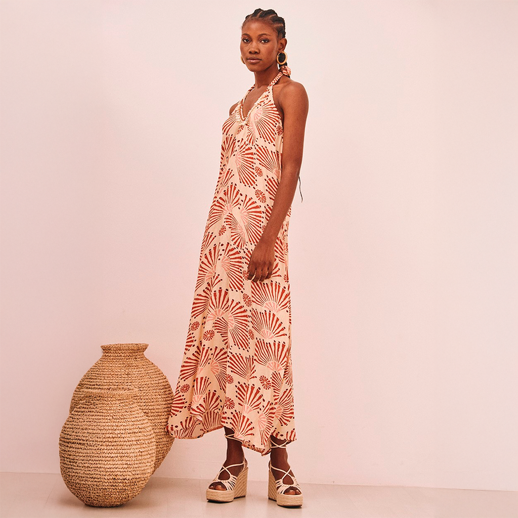 Another one of our easy to wear summer holiday dresses. Embellished with genuine hand carved, mother of pearl buttons and golden seed beads around the neck line. Simply step in and secure the halter-neck with two generous ties.