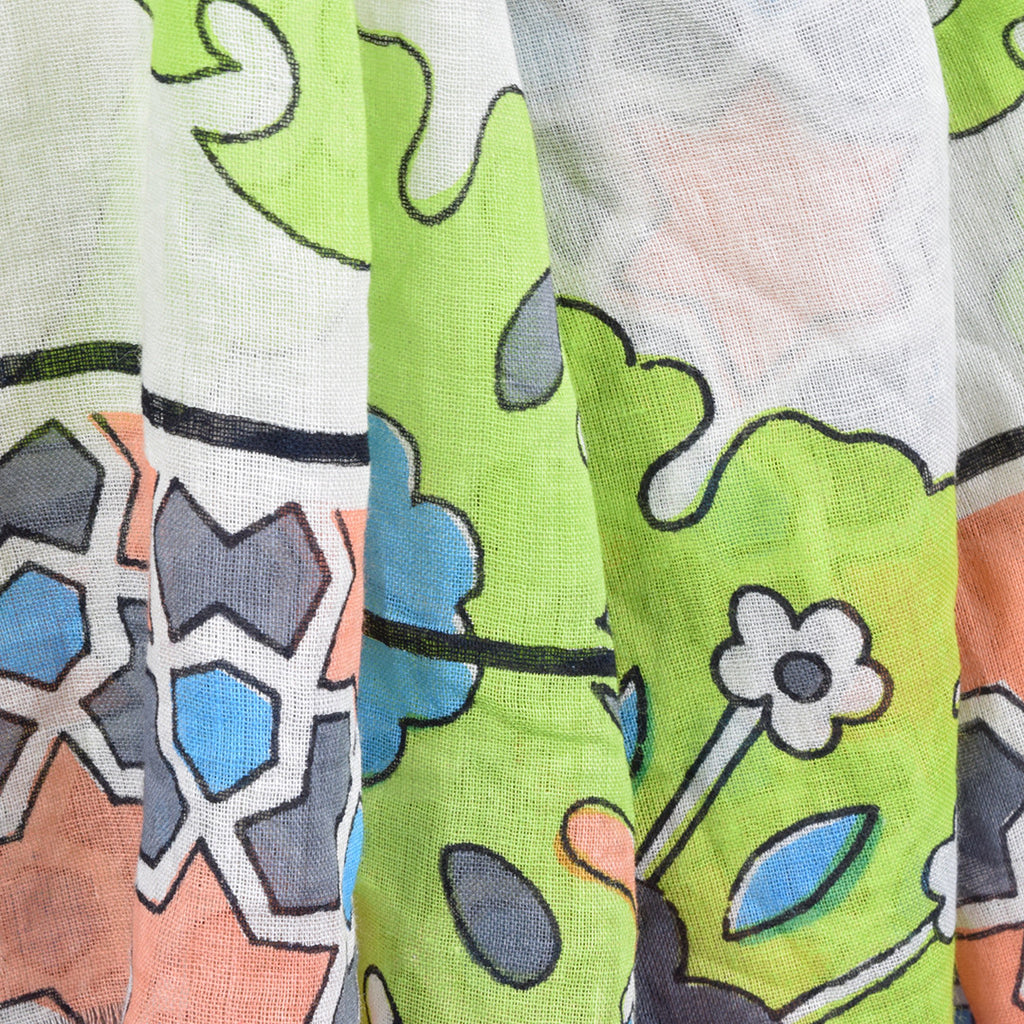 A pretty summer scarf from One Hundred Stars, in a geometric design with peach stars, green flowers and accents of blue and dark grey.