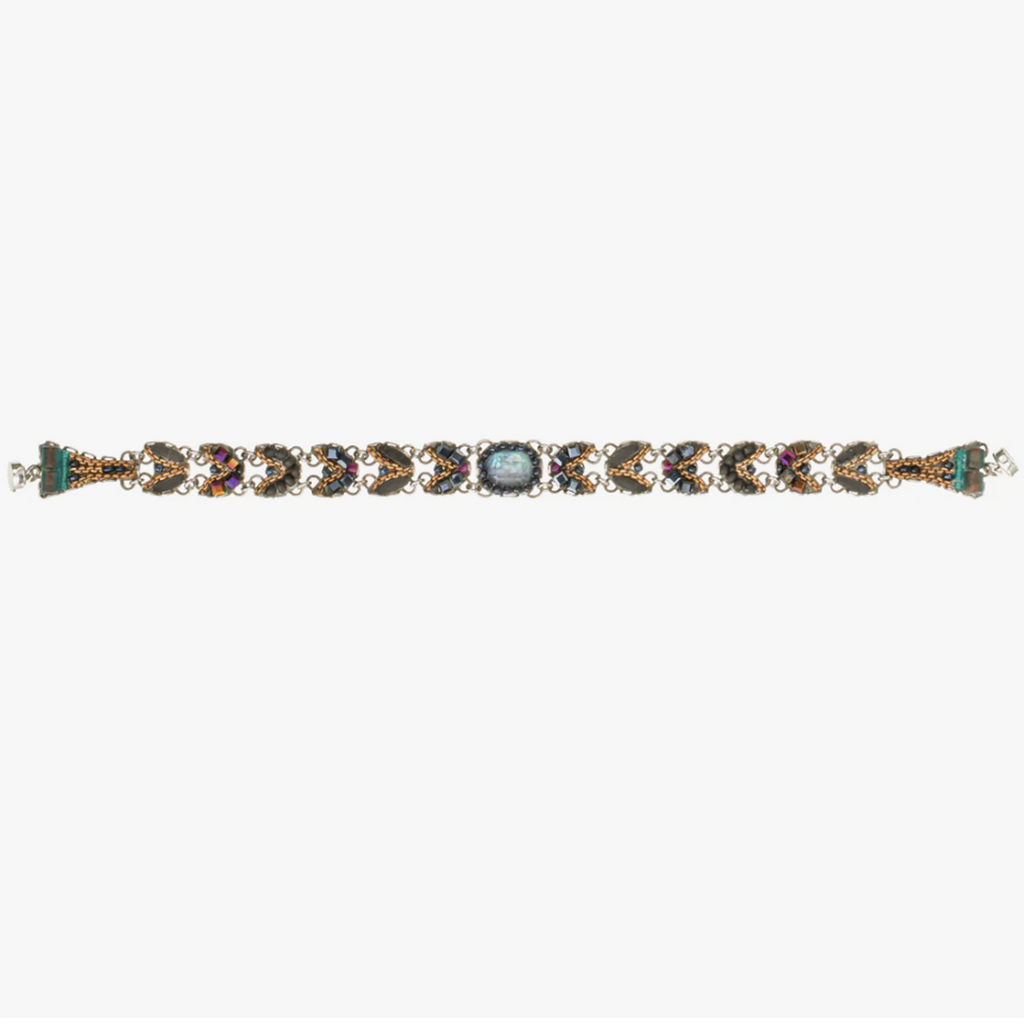 A Selection of Materials Used: Semi-precious stones, faceted glass, fabric inlays, seed pearls, seed beads, silver-plated brass, metal alloys. Nickel and lead free.