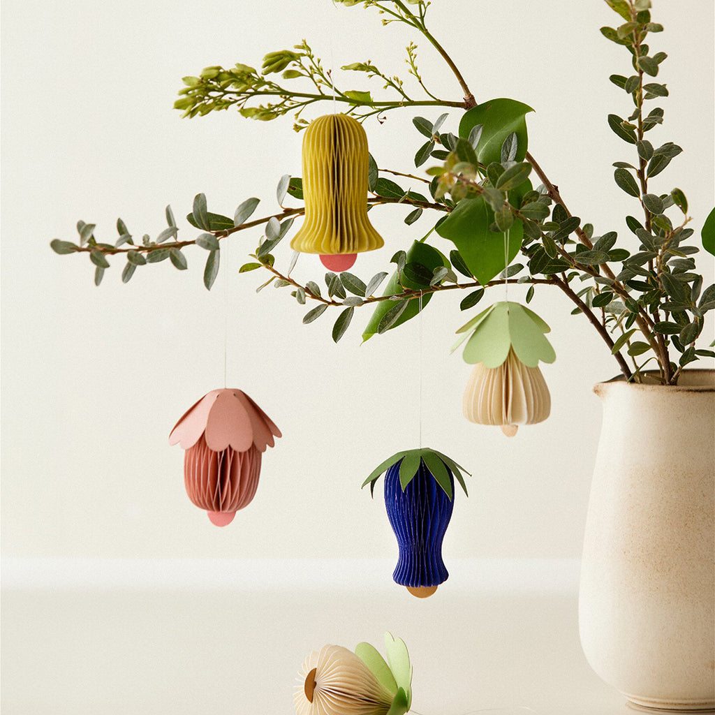 A boxed set of four pretty honeycomb paper hanging decorations. Suspend in clusters from branches in a large vase to brighten your Easter table. Contrasting 'Grosgrain Ribbon' is available in our shop or on our website.